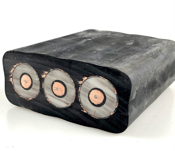 2)動力傳輸扁電纜:導(dǎo)電線芯+內(nèi)半導(dǎo)電層+絕緣層+外半導(dǎo)電層+銅絲編織與加強層+外護層