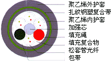 產(chǎn)品型號: GYSTY53也叫(GYTY53) 光纖松套 纜芯填充油膏 金屬中芯加強(qiáng)PE內(nèi)護(hù)套 雙面涂塑軋紋鋼帶粘結(jié)PE外護(hù)套